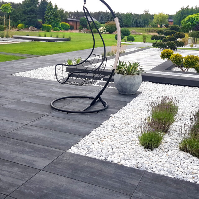 Talamona to duża płyta o nowoczesnym, prostym kształcie i niepowtarzalnej kolorystyce. Idealnie nadaje się do budowy tarasów, ścieżek i przejść, wprowadzając do przestrzeni wyjątkowy charakter. Jej duża powierzchnia podkreśla efektowną kolorystykę i subtelne przejścia tonalne melanży, które doskonale współgrają z innymi materiałami, architekturą oraz roślinnością, tworząc elegancka i przytulną przestrzeń.